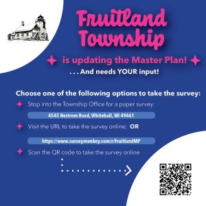 If you haven’t already done so, please take the time to fill out the survey for the Fruitland Township Master Plan. This survey is an important way to make your voice heard when it comes to the future of Fruitland Township.